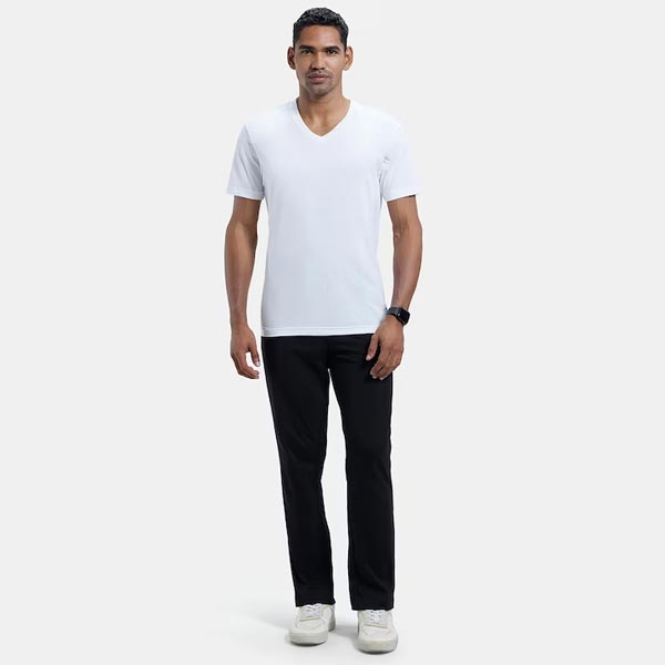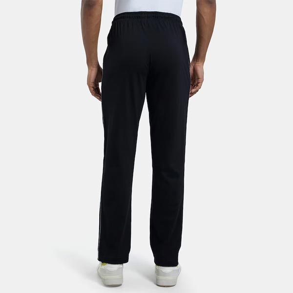 A pair of black solid track pants, has an elasticated waistband with drawstring closure, two pockets