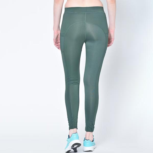 A pair of green solid stretchable yoga tights, has an elasticated waistband & slip-on closure and two side pockets
